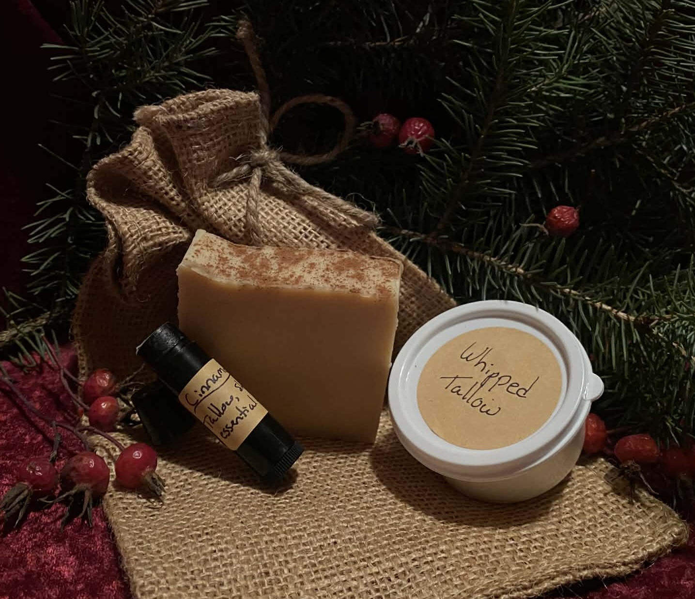 Wrap yourself in the cozy embrace of the holidays with the Cinnamon Orange Trio Gift Bag from Hannah at Kidding Around Homestead. This festive collection features three handcrafted essentials, each infused with premium grass-fed beef tallow and a warming blend of cinnamon and sweet orange essential oils for uplifting, skin-nourishing care that evokes mulled cider and crackling fires.Grass-fed tallow anchors every product – a richly compatible moisturizer that echoes the natural composition of human skin. Loaded with vitamins A, D, E, and K, plus beneficial fatty acids, it delivers deep, lasting hydration, strengthens the skin's barrier, reduces inflammation, and restores elasticity. It melts effortlessly into the skin with no greasy feel, making it perfect for all skin types, especially during dry winter months.The signature scent comes from pure cinnamon and sweet orange essential oils. Sweet orange brings a bright, citrusy uplift that energizes the senses and supports mood, while cinnamon adds warm, spicy depth with gentle circulation-boosting and antimicrobial properties. Together, they create an aromatic experience that's comforting yet invigorating – ideal for cold seasons, holiday gifting, or anytime you crave a little warmth. The blend also offers mild antioxidant protection and a natural glow-enhancing effect.The Cinnamon Orange Trio includes: